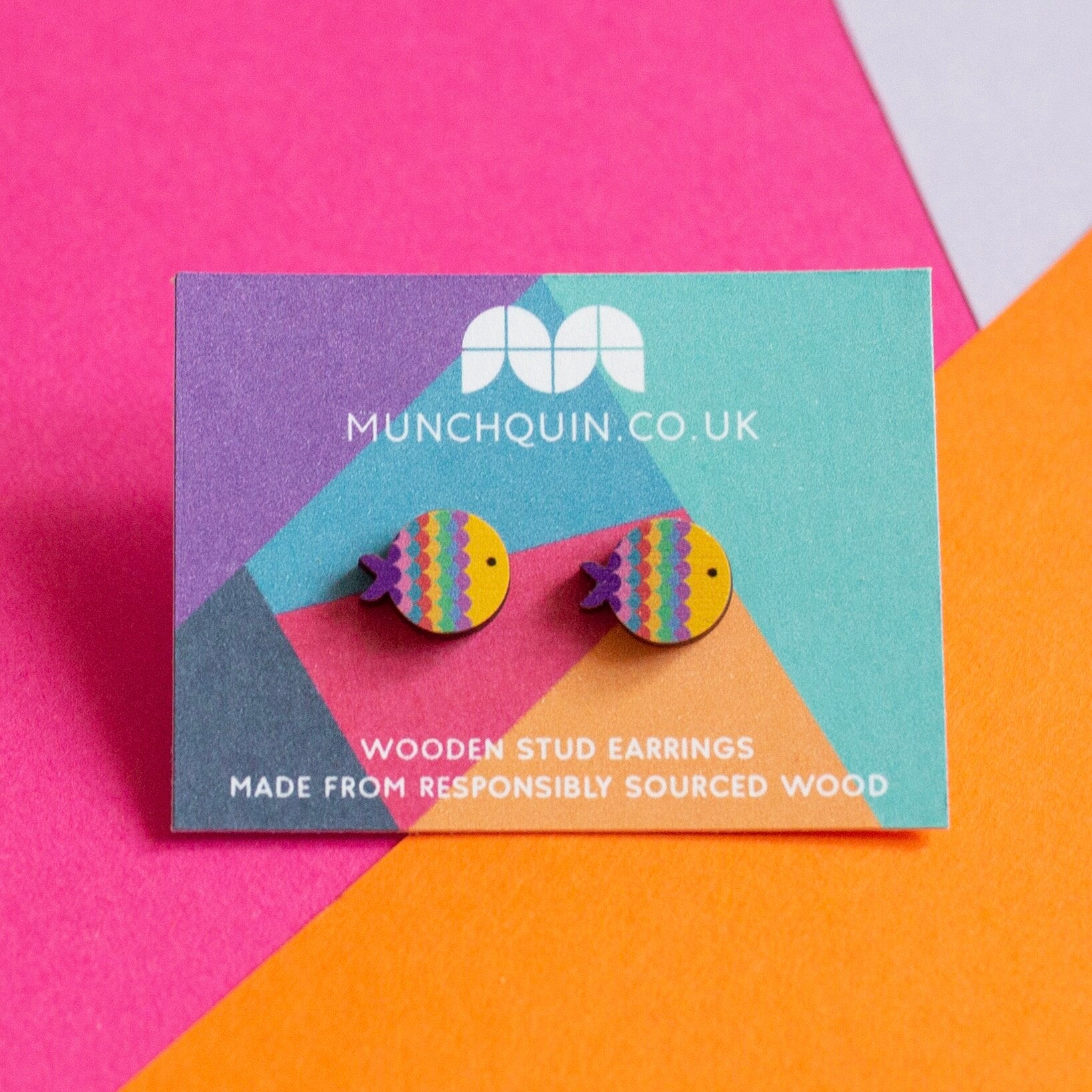 Superschattige houten oorknopjes met goudvissen, gemaakt van duurzaam geproduceerd berkenmultiplex en roestvrijstalen stekertjes — perfect voor gevoelige oren!