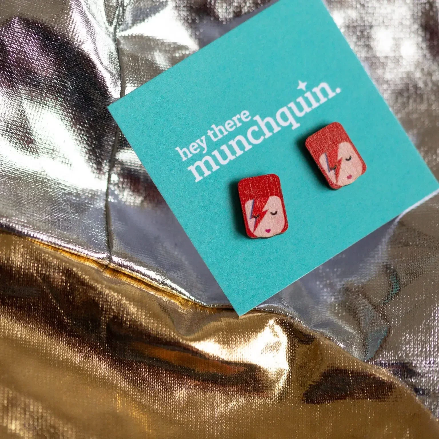 Superschattige houten oorknopjes geïnspireerd op David Bowie, gemaakt van duurzaam geproduceerd berkenmultiplex en roestvrijstalen stekertjes — perfect voor gevoelige oren!