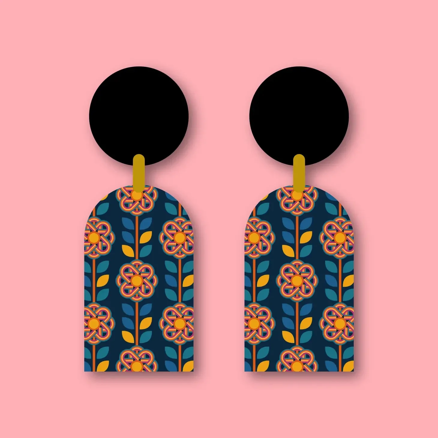 Maak een statement met een paar retro bengeloorbellen met bloemen; retro-geïnspireerde, milieuvriendelijke lichtgewicht houten statement-oorbellen, gemaakt van duurzaam geproduceerd berkenmultiplex en roestvrijstalen stekertjes.