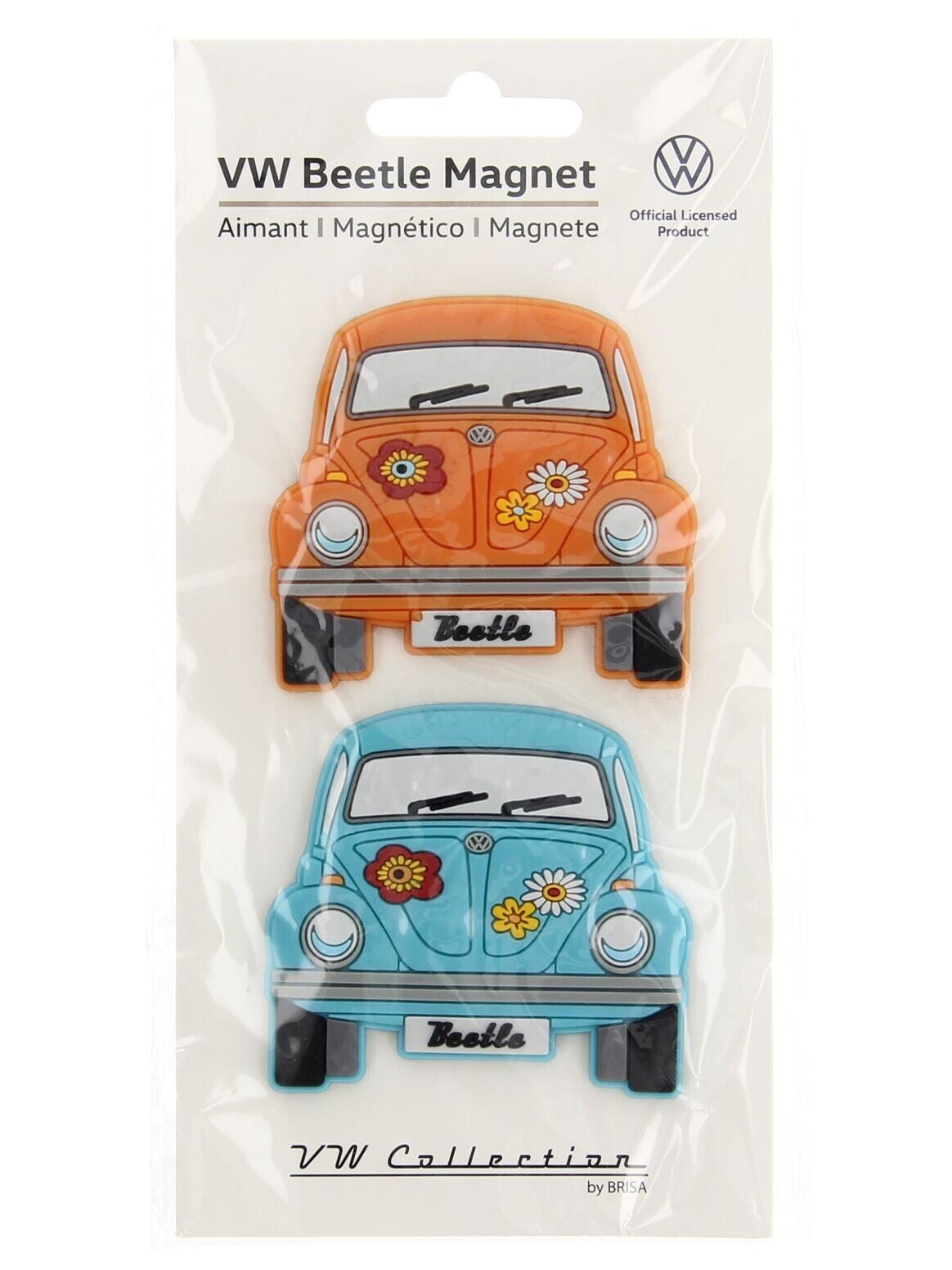 Set van 2 stevige rubberen magneten met de voorkant van de legendarische en geliefde VW Kever in oranje en blauw.