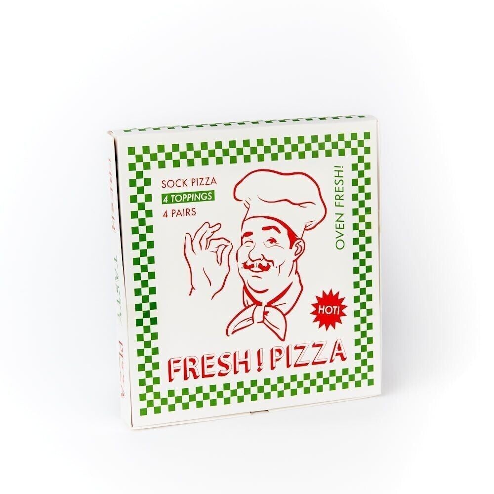 4 heerlijke paar sokken in pizza-thema verpakt in een geschenkdoos voor pizzapunten.