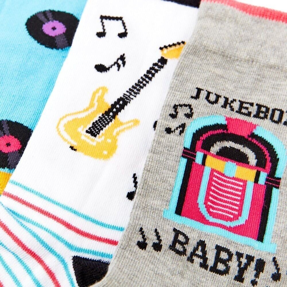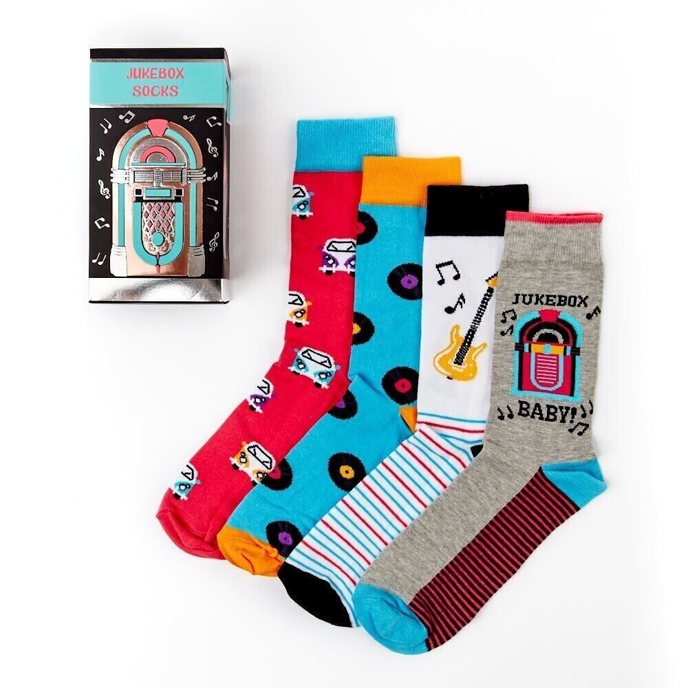 4 paar sokken in jukebos-thema verpakt in een leuke geschenkdoos.