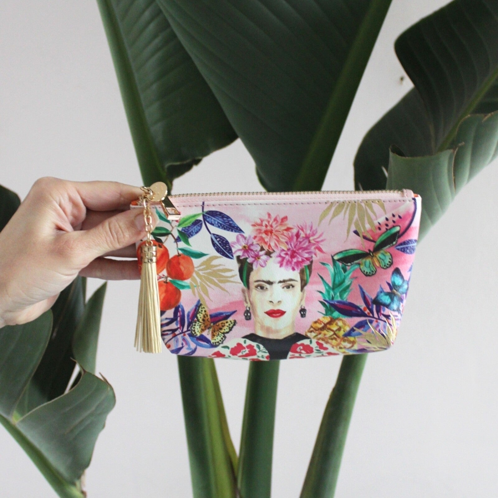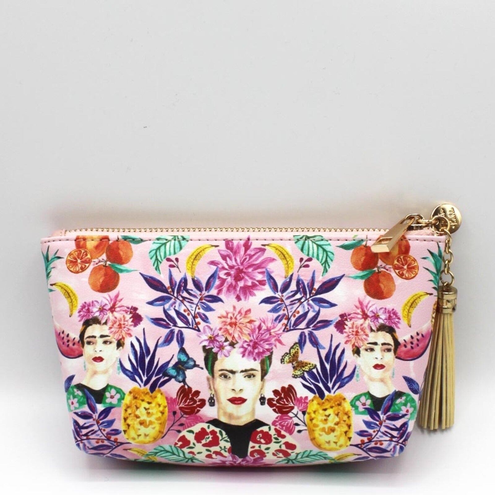 Een prachtige make-uptas met Frida Kahlo in een kleurrijke aquarel, inclusief bloemen- en fruitillustraties. Het tasje heeft een gegraveerde Frida Kahlo-ritssluiting en een gouden PVC-kwastje.