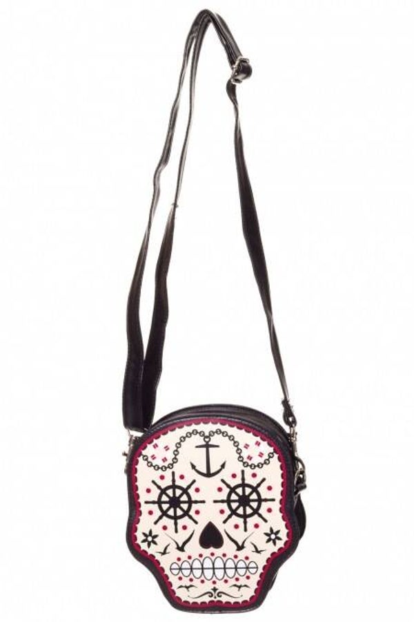 Ankers, zwaluwen, hartjes... hoe langer je kijkt, hoe meer sailor-iconen je ontdekt! 🏴☠️ De kunstleren schedel is met haar afmetingen van 20 cm hoog en 17 cm breed net iets groter dan de tas zelf, die 19 cm hoog, 15 cm breed en 7 cm diep is. Perfect om je telefoon en al je belangrijkste spulletjes in mee te nemen! 📱💄