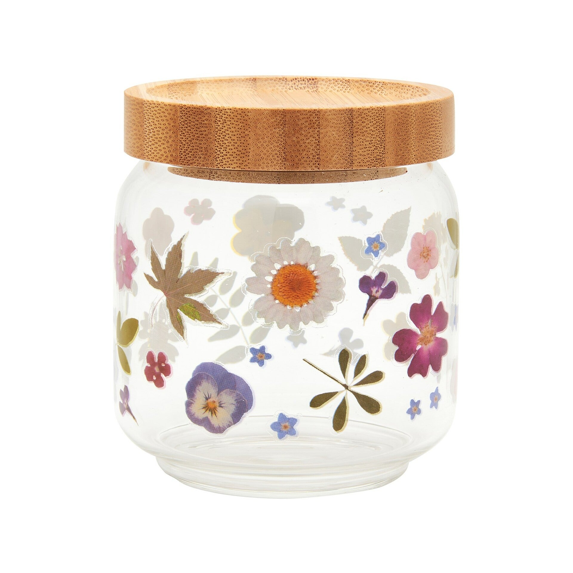 Laat je dan verleiden door deze mooie voorraadpot met een prachtig bloemendesign. Afsluitbaar met een natuurlijk bamboe deksel en heeft een transparante glazen bodem.