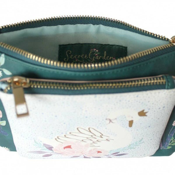 Prachtig make-up tasje dat bestaat uit twee zip-tasjes met verschillende afmetingen die samen met drukkers worden bevestigd. Het kleinere zakje toont een broedende zwaan met goudkleurige details. Het grotere zakje is geïllustreerd met riet en waterlelies. De binnenzijde is gemaakt van een lichtblauwe katoenen voering.