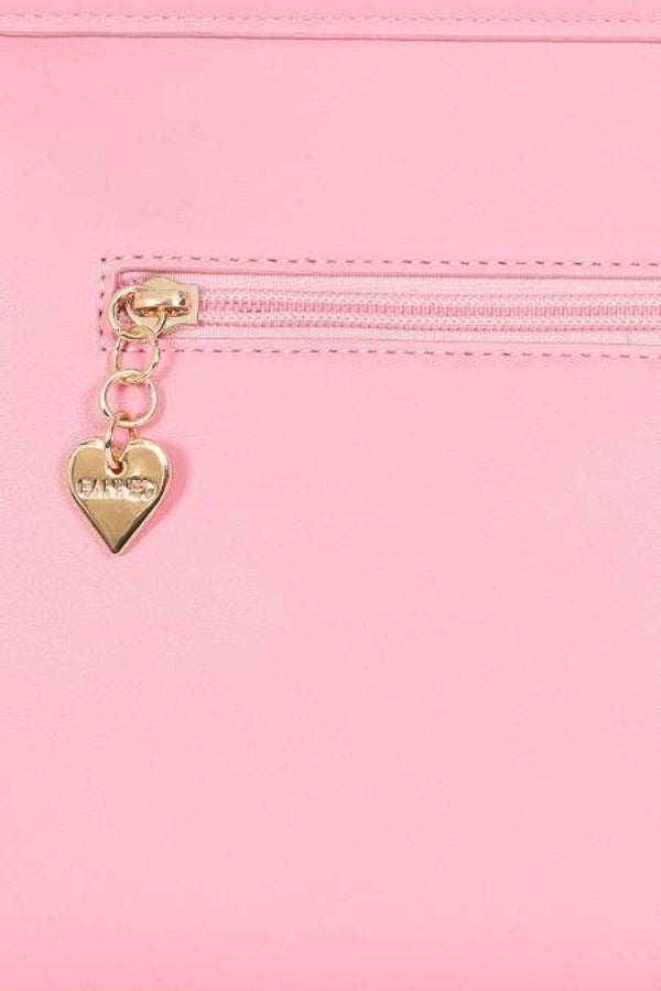 Dit prachtexemplaar is uitgevoerd in roze en wit gestreept imitatie leder met een kort handvat en een klein strikje op de voorklep.