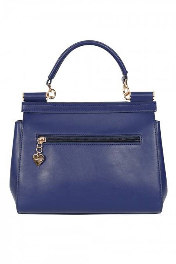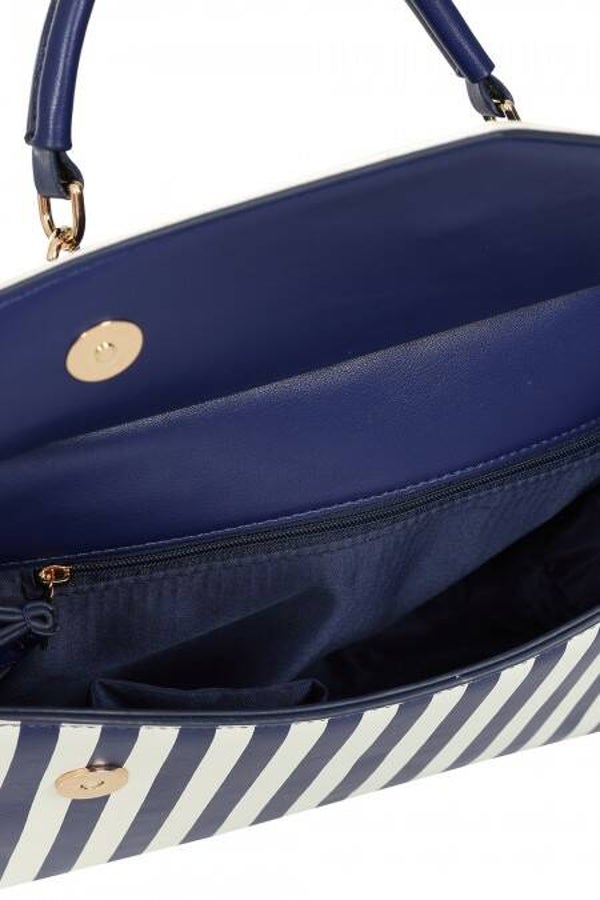 Dit prachtexemplaar is uitgevoerd in blauw en wit gestreept imitatie leder met een kort handvat en een klein strikje op de voorklep.
