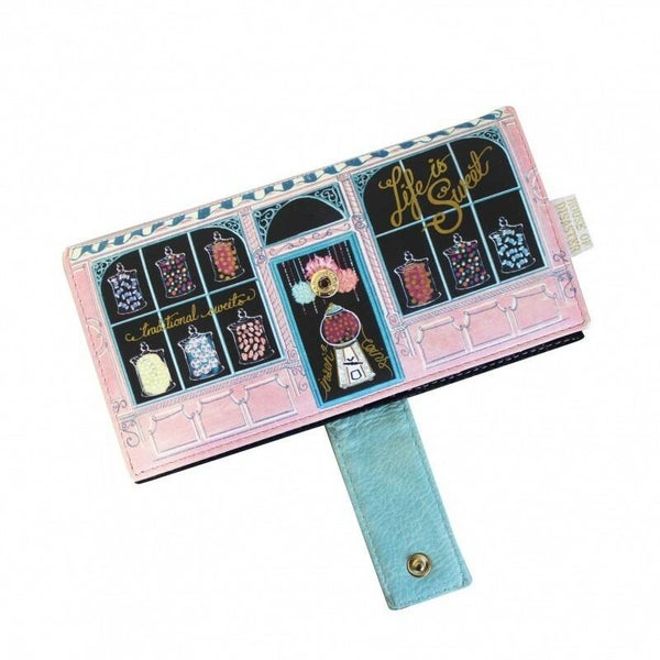 Geld uitgeven is nog leuker met deze roze en turquoise portemonnee in de vorm van een traditioneel snoepwinkeltje. Ook de binnenkant heeft een lief patroon en een lieflijke ritssluiting. Er zijn twee volledige vakken, een vak met rits voor los geld en veel vakjes voor kaarten en pasjes.