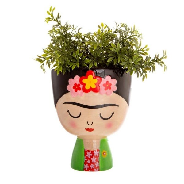 Deze bloempot toont Frida met blozende wangen, fladderende wimpers en een krans van mooie bloemen in haar zwarte haar. Een kleine maar indrukwekkende toevoeging aan uw plantenhoek.