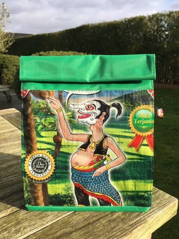 Een klassiek ontwerp nagebootst: de oude bruine papieren lunchtas! Dit zakje is iconisch en daarenboven ook nog eens milieuvriendelijk en duurzaam want het is gemaakt van gerecycleerde rijstzakken.