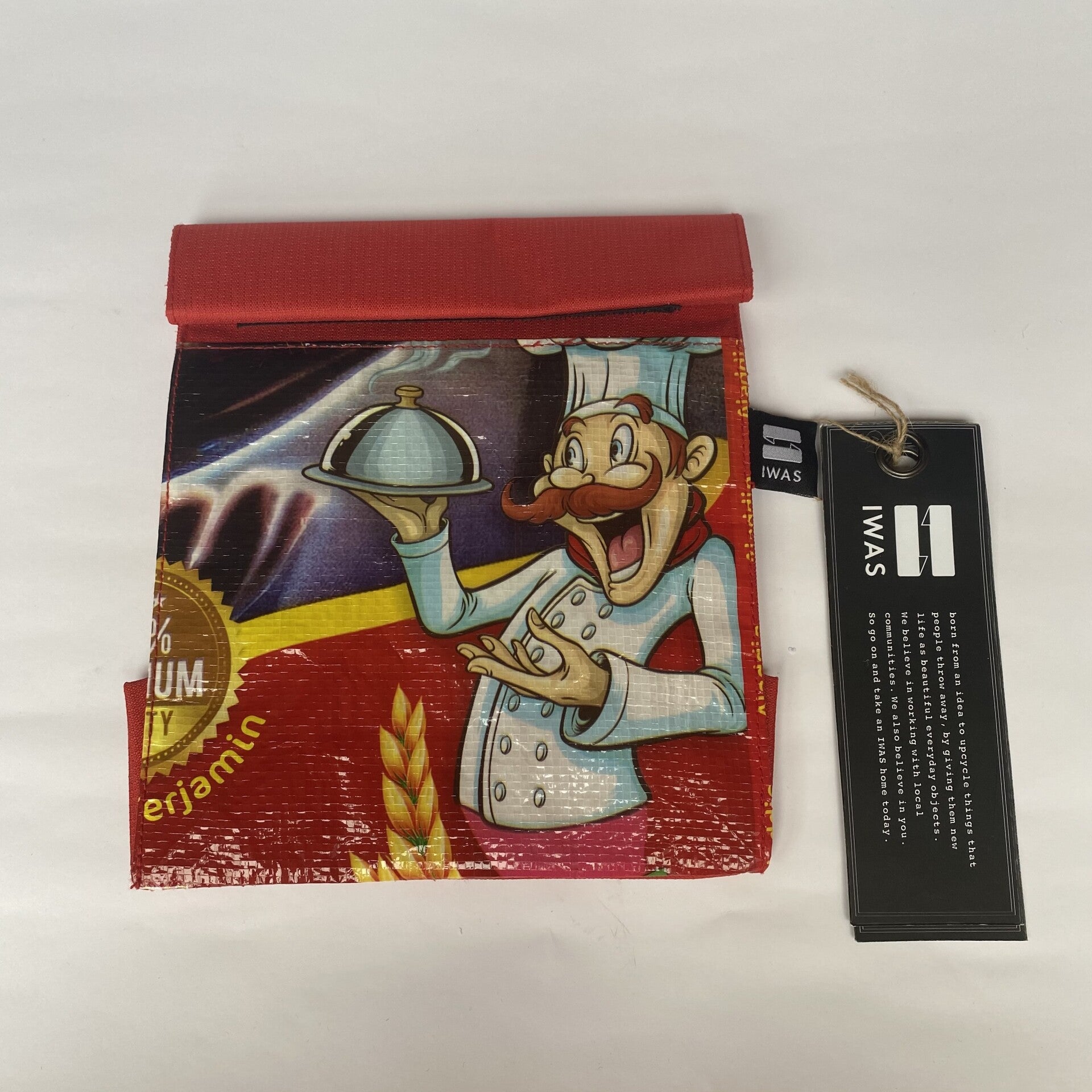 Een klassiek ontwerp nagebootst: de oude bruine papieren lunchtas! Dit zakje is iconisch en daarenboven ook nog eens milieuvriendelijk en duurzaam want het is gemaakt van gerecycleerde rijstzakken.