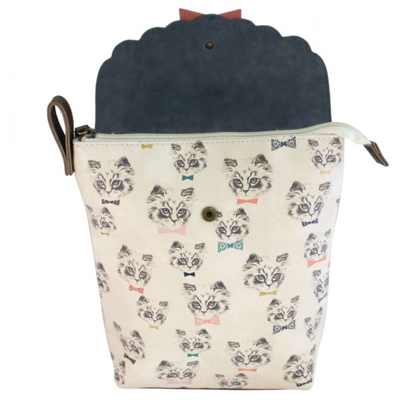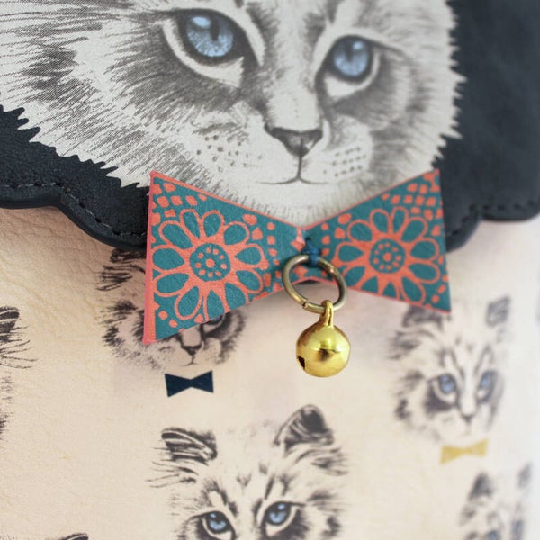 De overslaande klep van donkerblauw kunstleer heeft een mooie afbeelding van een kat er op geprint en een roze met blauw-groen strikje met gouden belletje.