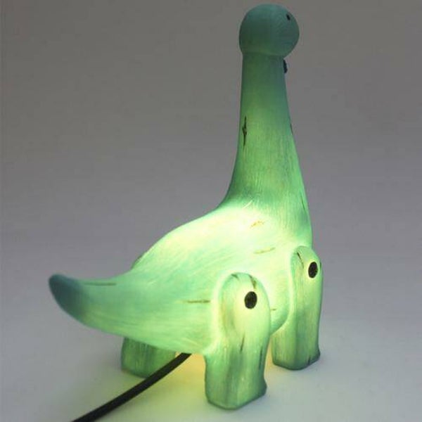 Deze vriendelijke dinosauruslamp is het perfecte nachtlampje voor elke kinderkamer. Het heeft een textuur met groen houteffect en de dino draagt een kleine vlinderdas voor extra schattigheid!