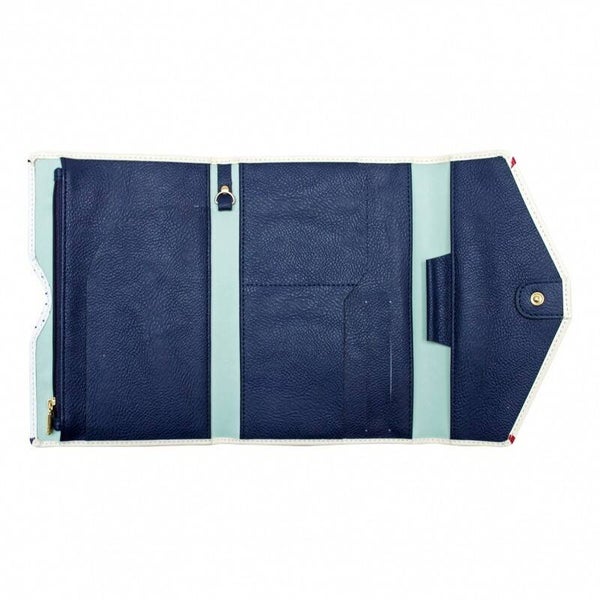De portemonnee bestaat ui drie delen die voldoende ruimte bieden voor alles wat je nodig hebt om mee te nemen. De portemonnee is gevoerd met een lichtblauwe, gekleurde stof en de delen zijn gemaakt van een donkerder, marineblauw, imitatieleer. Het onderste gedeelte van deze portemonnee heeft een geldbeugeltje met rits om uw munten in op te bergen en een gedeelte daarachter voor uw notities. In dit gedeelte kun je ook je instapkaarten of tickets bewaren, zodat ze niet onderaan je tas belanden en er is ruimte voorzien voor je creditcard(s).