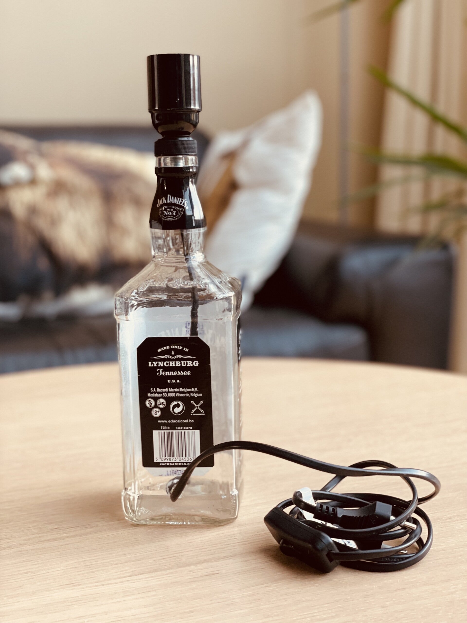 Mooie tafellamp gemaakt van een gerecylceerde 1 literfles Jack Daniel's Whiskey. Mooi warm licht.