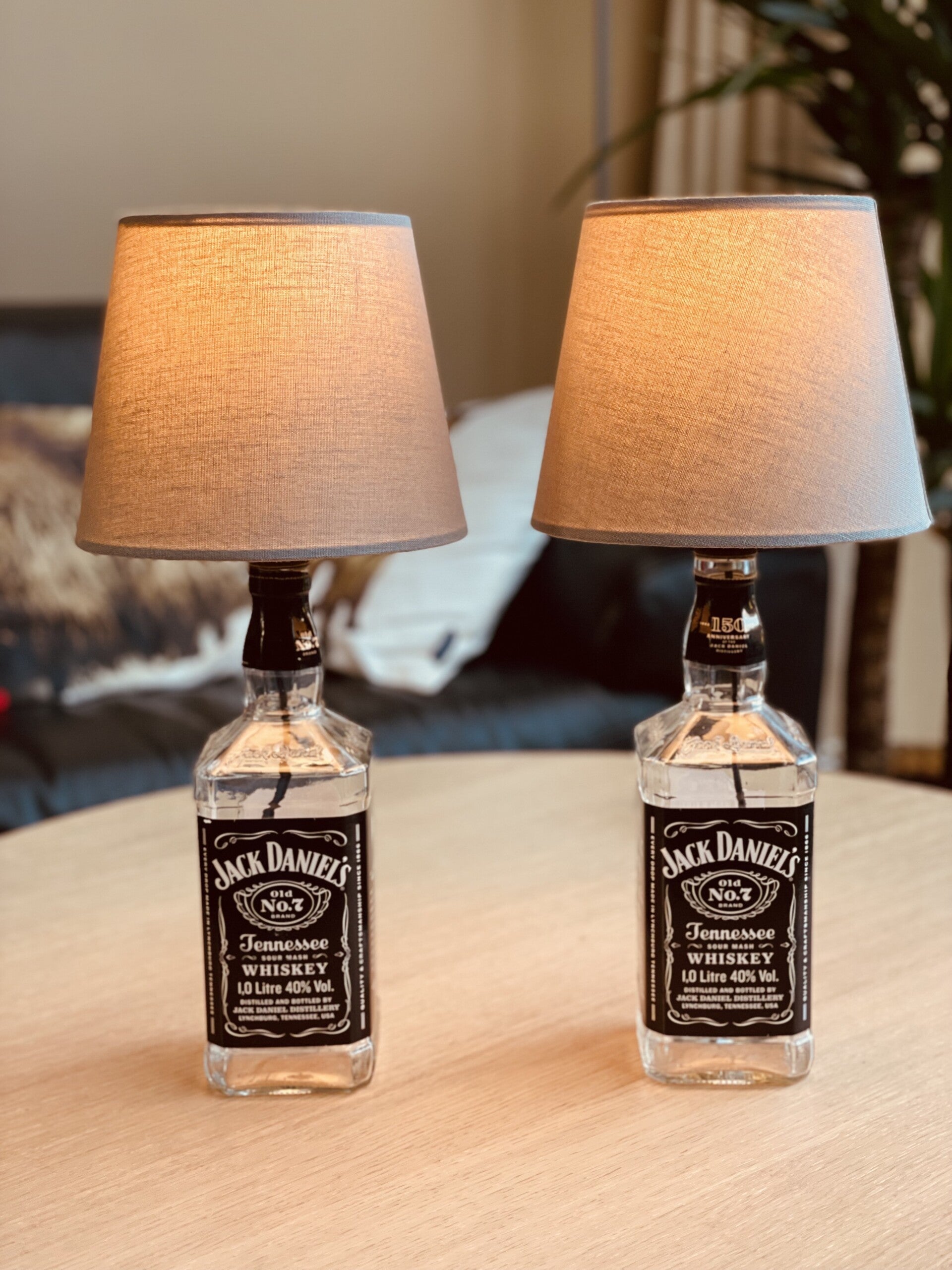 Mooie tafellamp gemaakt van een gerecylceerde 1 literfles Jack Daniel's Whiskey. Mooi warm licht.