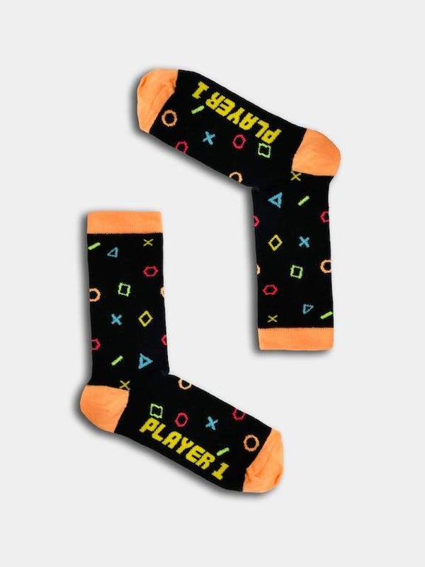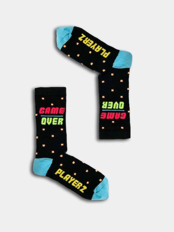 Het is 'GAME ON!' met 2 felle paar gamersokken in een game-thema geschenkdoos.