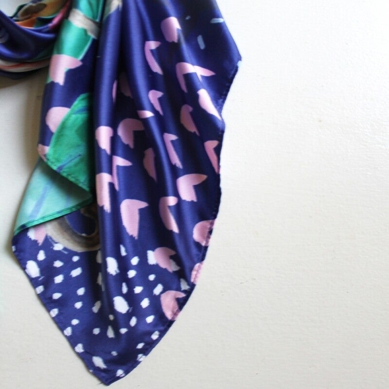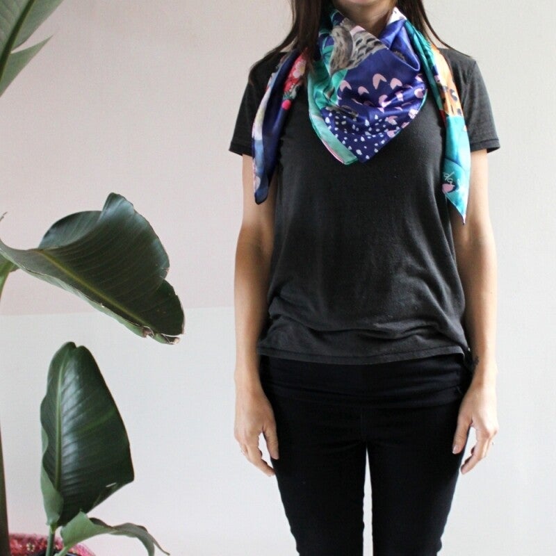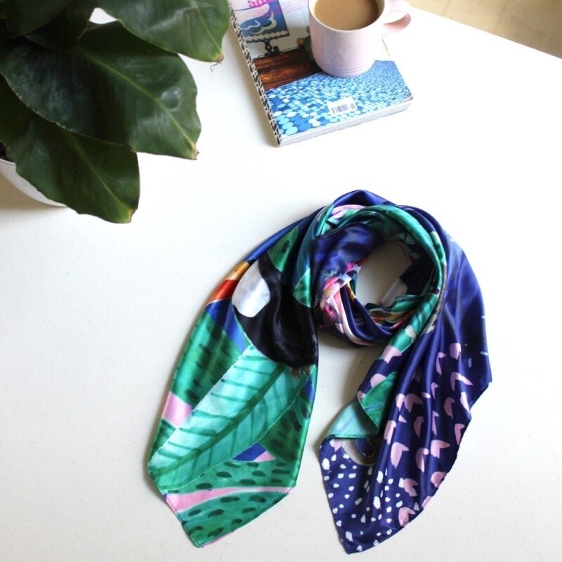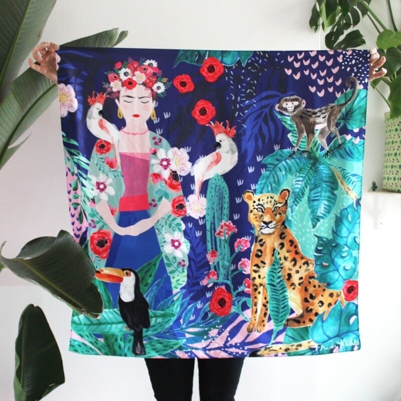 Wat denk je van deze stijlvolle vierkante sjaal met een satijnen textuur, met een tropische aquarelprint met illustraties van Frida Kahlo en jungledieren.